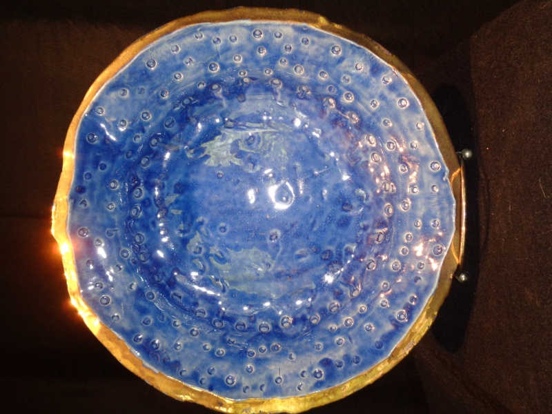 Hand build, clay, single glaze, gold luster rim, one of a kind